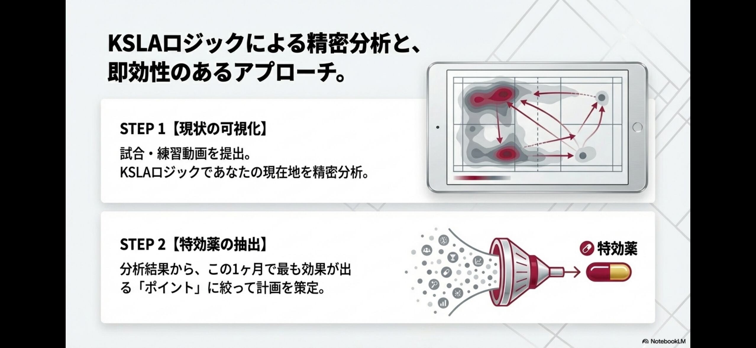 ①【現状の可視化】 試合や練習動画をご提出ください。KSLA独自のロジックであなたの現在地とNG習慣を精密に分析(スキャン)します。