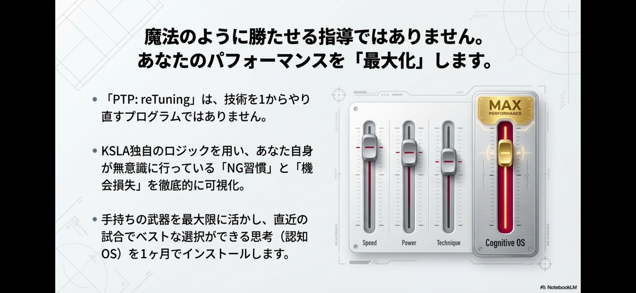 『PTP: reTuning』は、魔法のように勝たせる指導ではなく、あなたの現状のパフォーマンスを「最大化」させる1ヶ月の集中プログラムです。フォームの大改造ではなく、今ある手持ちの武器を最大限に活かし、直近の試合でベストな選択ができる思考(認知OS)をインストールします。