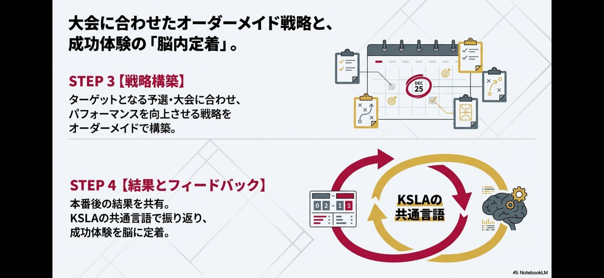 ④【結果とフィードバック】 本番後の結果をKSLAの共通言語で振り返り、成功体験を脳に定着させます。