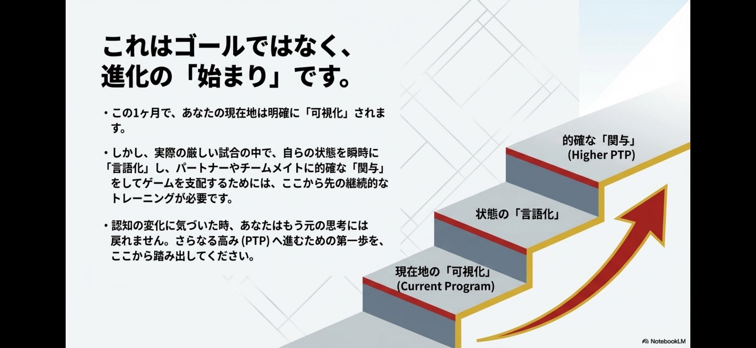 この1ヶ月で、あなたの現在地は明確に「可視化」されます。しかし、実際の厳しい試合の中で自らの状態を「言語化」し、パートナーに的確な「関与」をしてゲームを支配するには、継続的なチューニングが必要です。